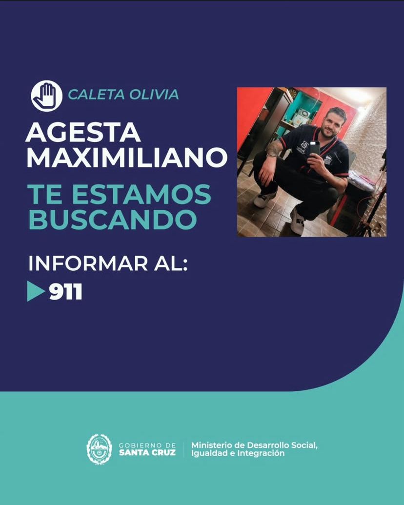 La Policía de Santa Cruz emitió un pedido de colaboración para dar con el paradero de Maximiliano Agesta, de 34 años, visto por última vez en la ciudad de Caleta Olivia.