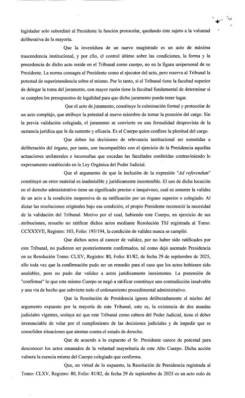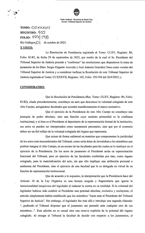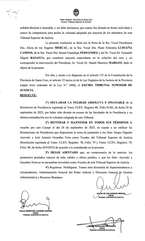 Por ello, el fallo advierte que el acto de jura que se llevó a cabo el jueves 25 de septiembre carece de validez jurídica por no haber sido ratificado por todos los integrantes del Cuerpo, y que Acevedo y González Nora no se encuentran investidos como vocales del Tribunal Superior de Justicia.