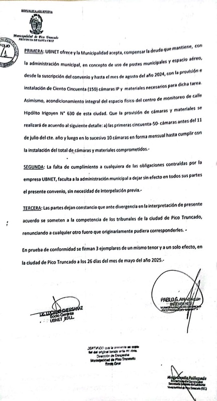Esta oficina municipal de vigilancia urbana nació a partir de un acuerdo que el intendente firmó con los representantes de una empresa de servicios de internet para que esta última compense una deuda que mantenía con el municipio por 40 millones de pesos. El acuerdo se firmó el 26 de mayo de 2025, y en él se dejó plasmado que la empresa ofrecía y el municipio aceptaba que la compensación de la deuda fuera a partir de la “provisión e instalación de ciento cincuenta (150) cámaras IP y materiales necesarios para dicha tarea”. También se dejaba asentado que las primeras 50 cámaras se entregarían antes del 11 de julio y que luego, en lo sucesivo, se entregarían 10 cámaras “en forma mensual hasta cumplir con la instalación total de cámaras y materiales comprometidos”.