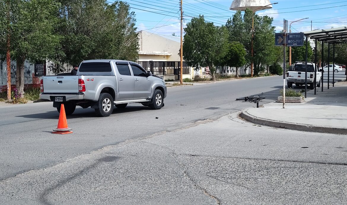 Alrededor de las 15:30 horas de este jueves se registró un accidente de tránsito en la intersección de las calles Mariano Moreno y Mitre. El hecho involucró a una camioneta Toyota Hilux y una bicicleta en la que circulaba un hombre.