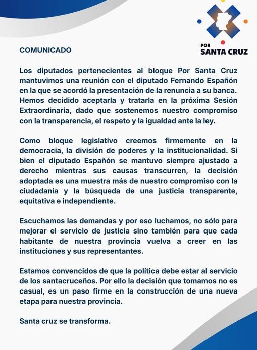 El bloque de diputados provinciales Por Santa Cruz informó que aceptará la renuncia presentada por el legislador Fernando Españón y que la misma será tratada en la próxima sesión extraordinaria de la Cámara de Diputados, según se desprende de un comunicado oficial difundido en las últimas horas.
