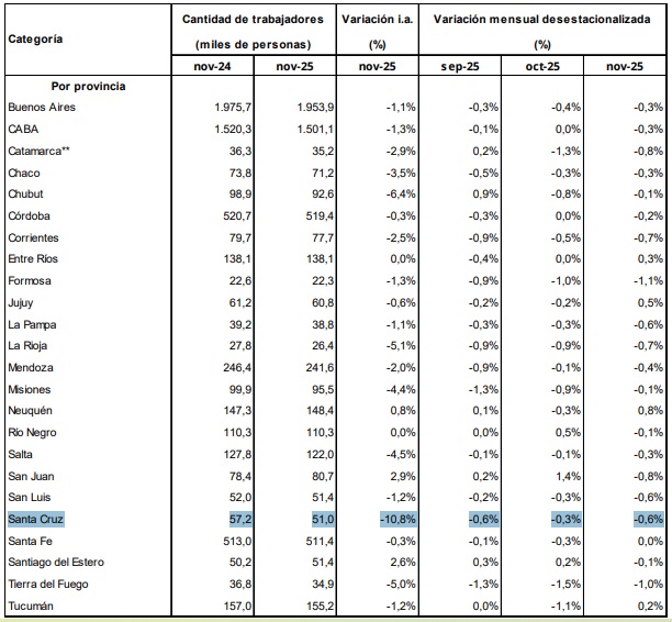 Un informe del Sistema Integrado Previsional Argentino (SIPA) ubica a Santa Cruz como el distrito que perdió más empleo privado registrado en el periodo comprendido entre noviembre de 2024 y noviembre de 2025, colocándola en el último lugar del ranking nacional.