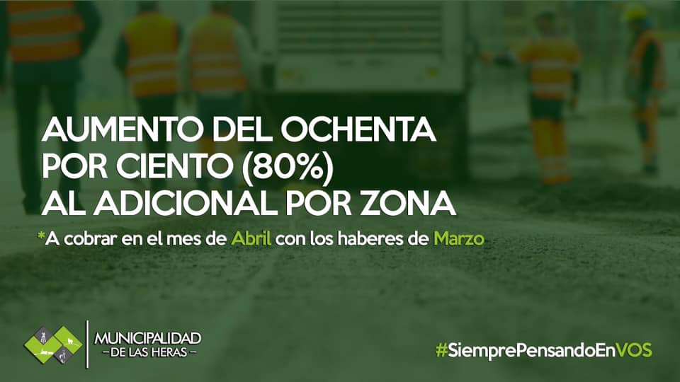 El Intendente Municipal Dr. José María Carambia anunció aumentos para empleados de planta permanente y/o contrato del Municipio de Las Heras en el mes de marzo (a cobrarse en Abril). *AUMENTO DEL OCHENTA POR CIENTO (80%) AL ADICIONAL POR ZONA. *AUMENTO DEL CINCUENTA POR CIENTO (50%) AL VALOR DEL HORA EXTRA. *MÁS BENEFICIOS A TRAVÉS […]